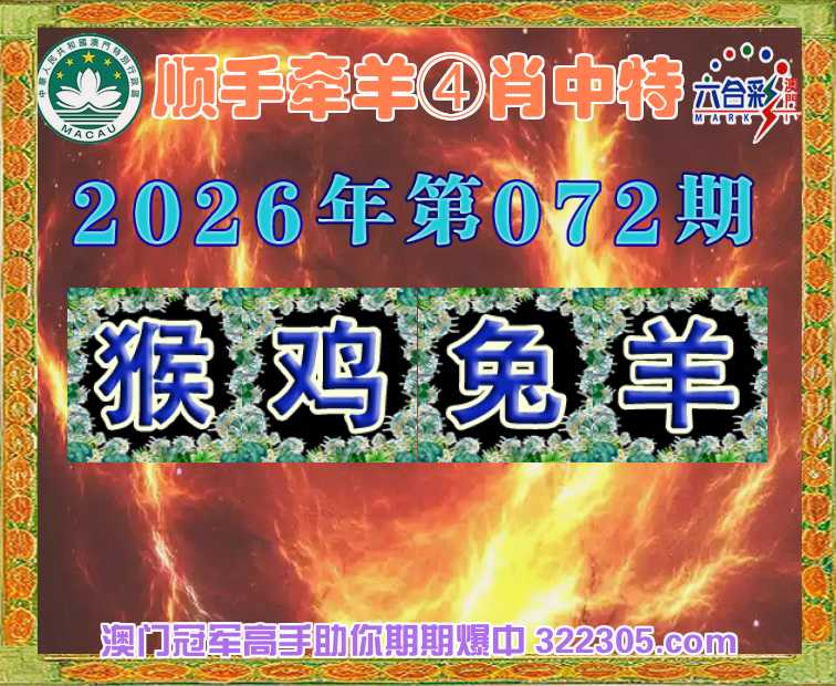 072期:【顺手牵羊】 🀄④肖中特🀄【猴.鸡.兔.羊】开:鸡46准